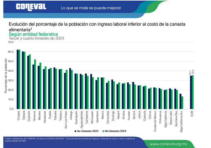 Las entidades con menor porcentaje de pobreza laboral fueron Baja California Sur, Baja California y Quintana Roo; mientras que las entidades con mayor porcentaje de pobreza laboral fueron Chiapas, Oaxaca y Veracruz, la tabla está actualizada al 4 trimestre del 2024 y se publicó en el 2025, no hay datos publicados de como estuvo en el 2025, aunque ya estemos en el 2026.